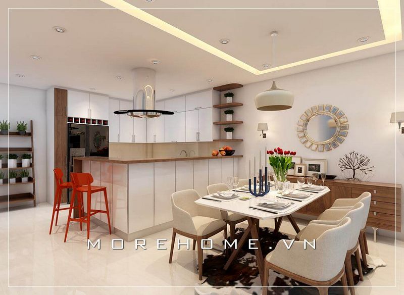 Sử dụng tone màu trắng để thiết kế nội thất phòng ăn chung cư theo phong cách hiện đại sẽ giúp không gian căn phòng sáng và thoáng mát hơn.
